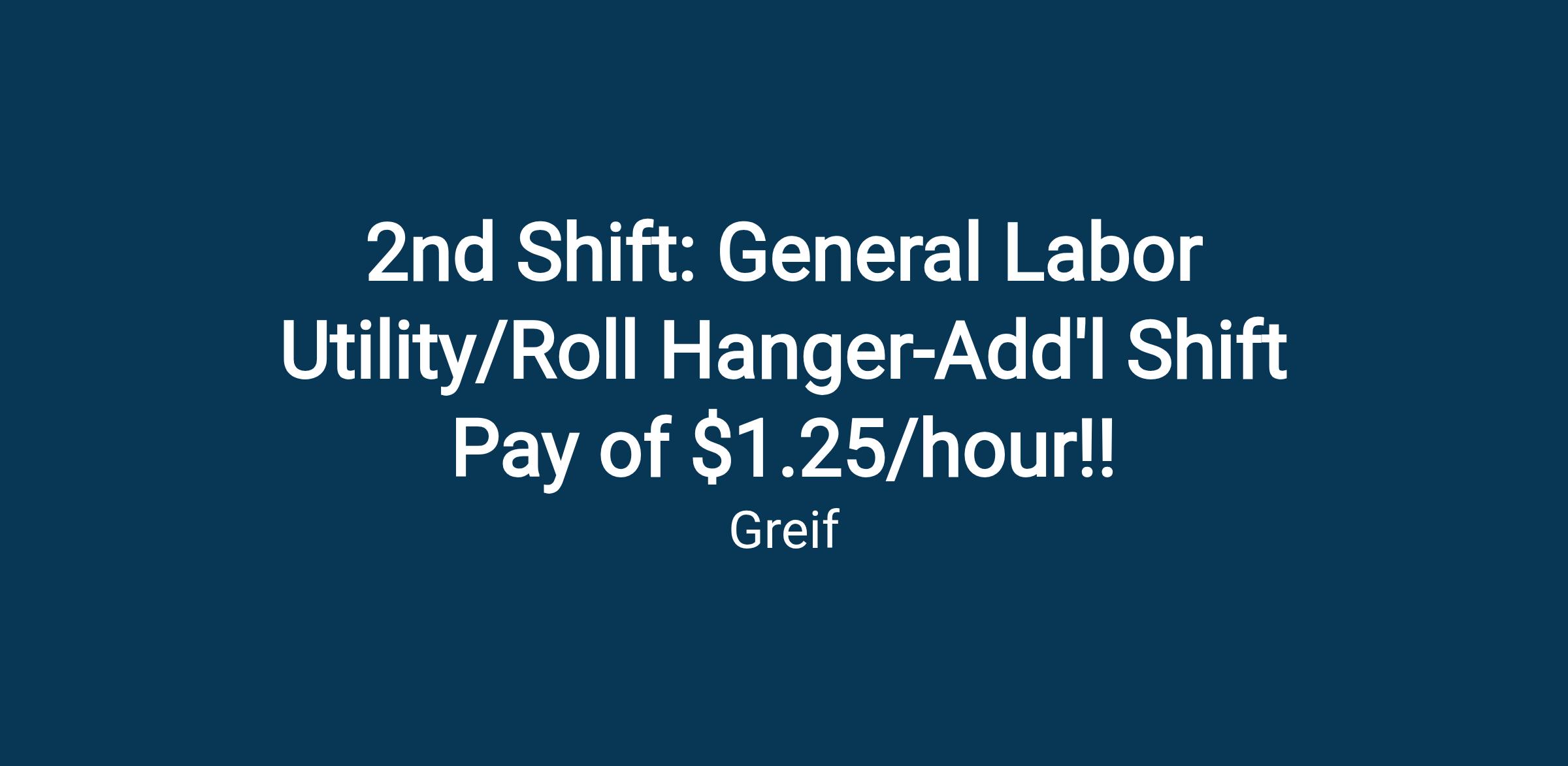 033217 2nd Shift: General Labor Utility/Roll Hanger-Add'l Shift Pay of $1.25/hour!! (Open)Job Description: