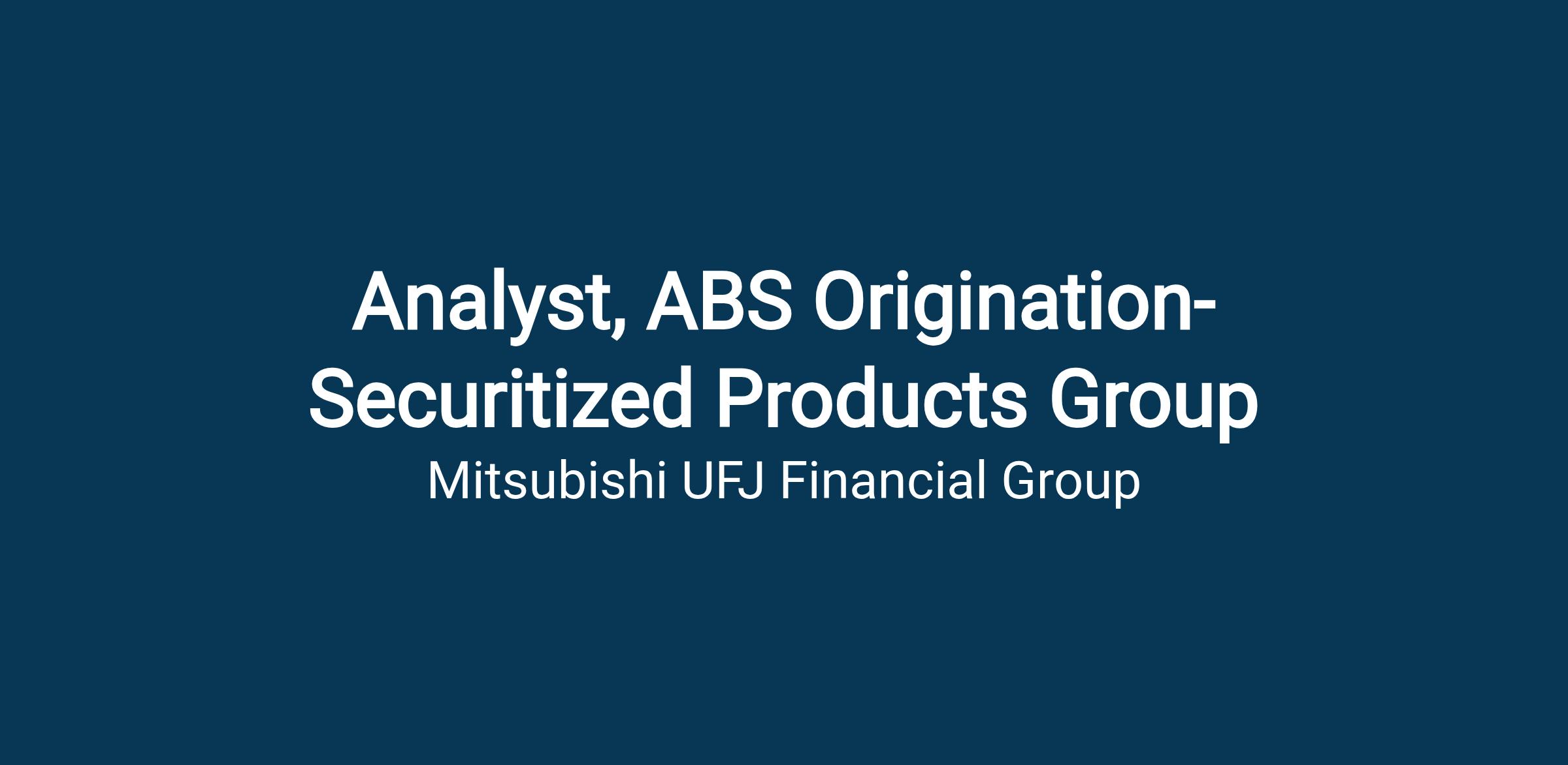 MUFG is seeking an Analyst to join the Securitized Products Group to help originate and execute warehouse and term ABS issuance opportunities and transactions in off the run asset classes including transportation, digital infrastructure, specialty finance, and media.