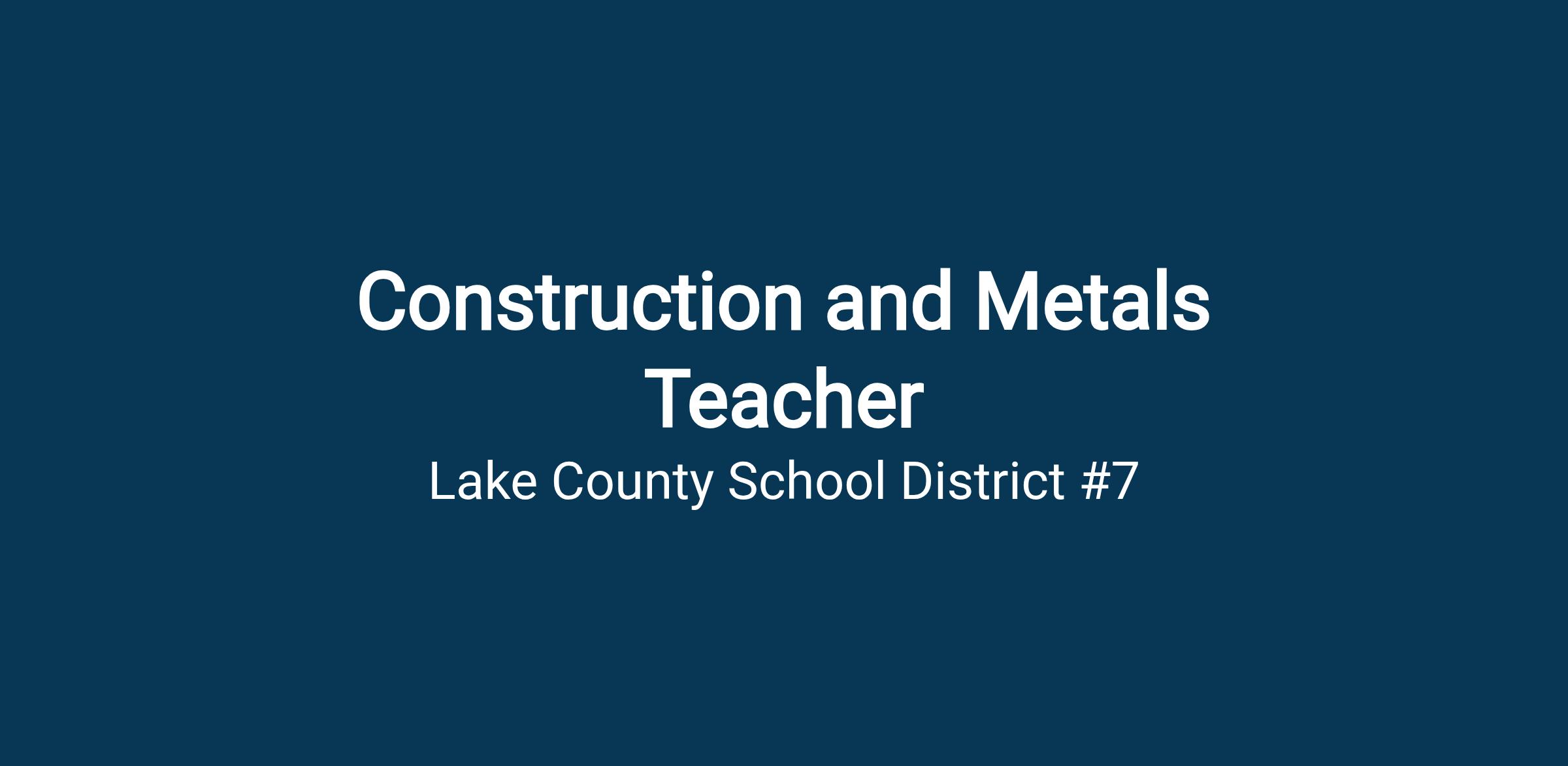 Lake County School District 7 is in search of a Construction and Metals Teacher, teaching grades 7-12 at the DMS/LHS schools for the 2026-2027 school year. The projected start date is August 2026. FTE 1.0. Salary Range $40,178 - $81,784. OPEN until filled.