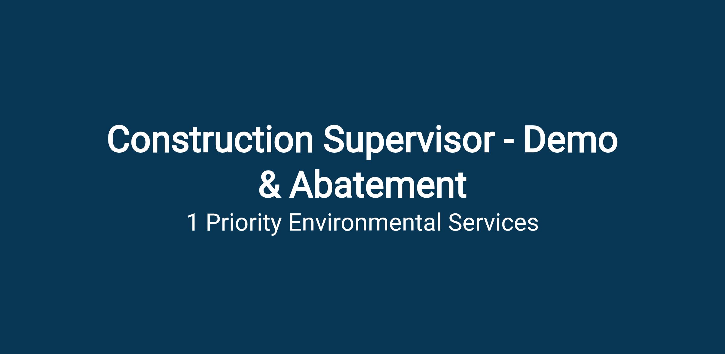 Are you ready to make a real difference while building a rewarding career in a skilled trade? At 1 Priority Environmental Services, the Georgia's premier environmental remediation firm, our Construction Supervisors are the first on site for commercial demolition and renovation projects-removing hazardous materials and making public spaces safer for everyone. From schools and hospitals to military installations and critical infrastructure, our work matters.