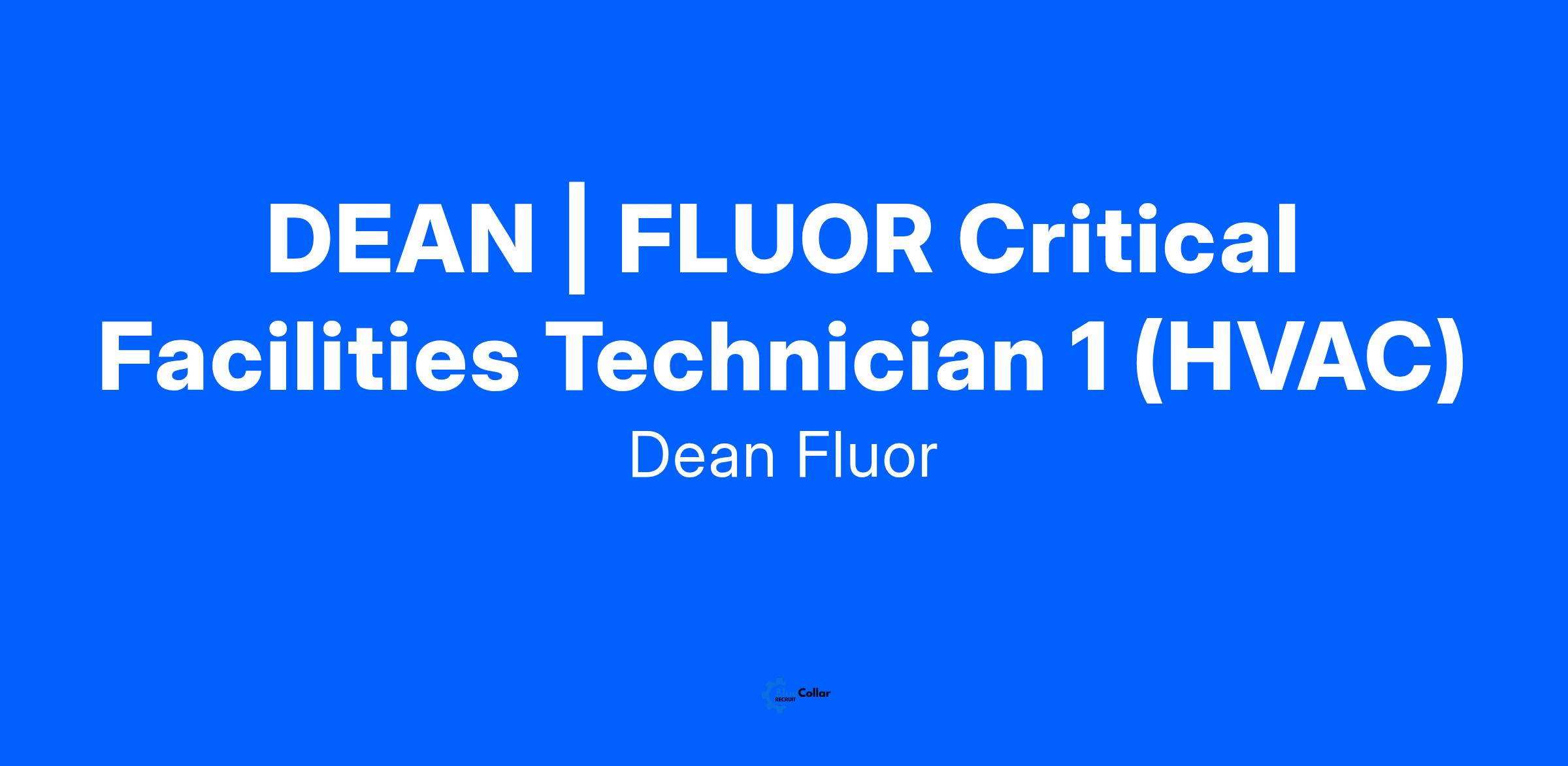 Dean | Fluor has an Exciting opportunity for an Entry Level Critical Facility Technician 1 (HVAC) at our data center. In this role you will be responsible for the reliability, maintenance, and enhancement of facility equipment. This is a day shift position with vacation, 401K, sick leave, and health insurance is available. This is a clean, safe, and friendly, team working Facility.