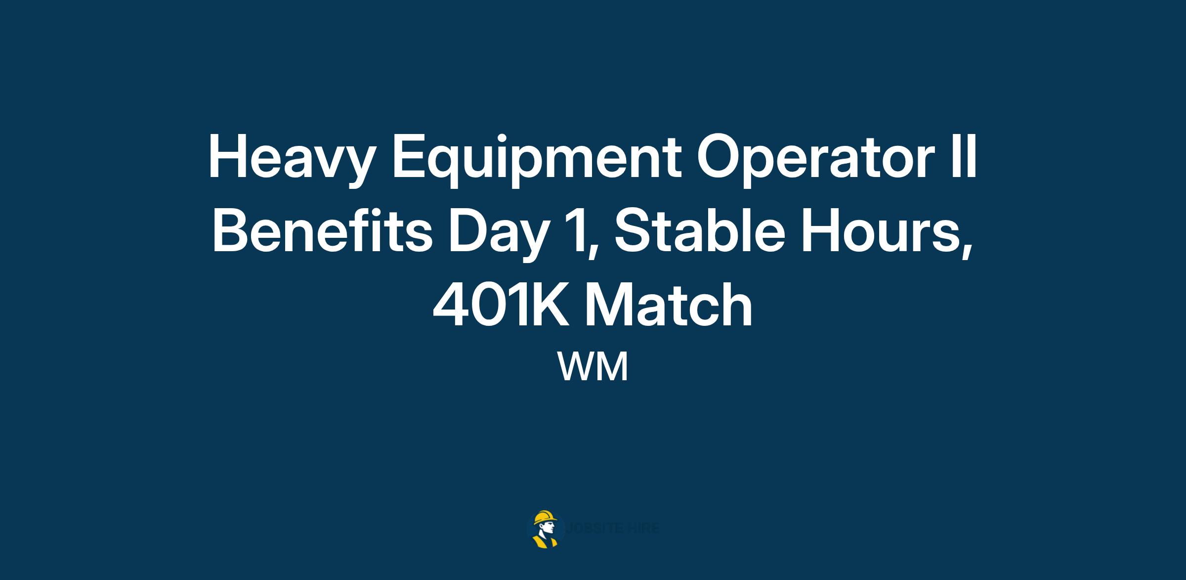 Are you looking for stable work as a Heavy Equipment Operator II with benefits that provide financial security for you and your family? Aspiring to advance in your heavy equipment career at a site that prides itself on employee safety? Searching for a company that prioritizes its employees' well-being and understands the importance of family time? If this speaks to you, then WM might be the place for your next career move.