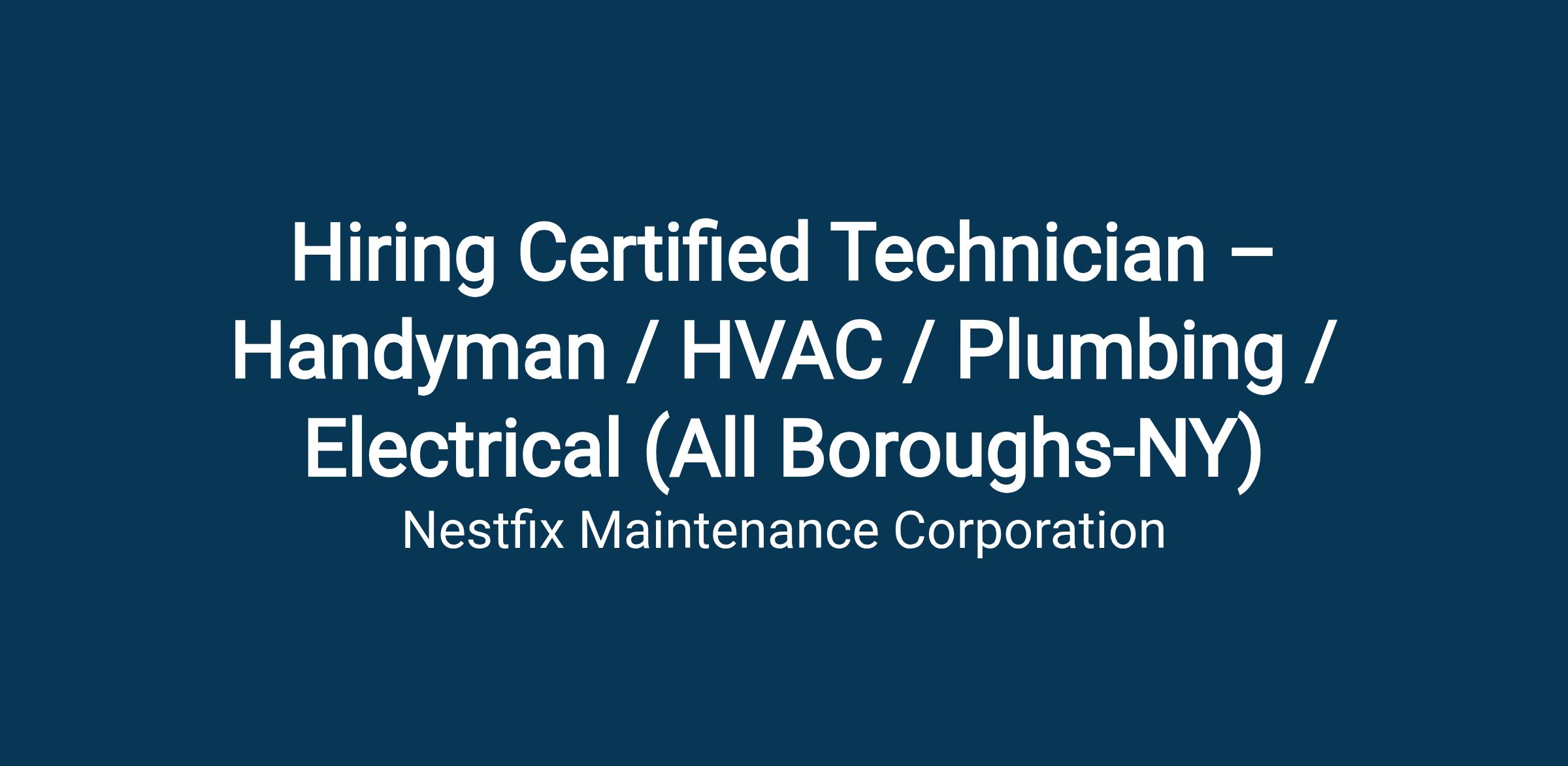 NestFix Maintenance Corp. is hiring certified handyman, HVAC, plumbing, and electrical technicians in (All Boroughs) New York City and surrounding areas. Flexible schedule, competitive pay, and consistent maintenance work available. Certifications required.
