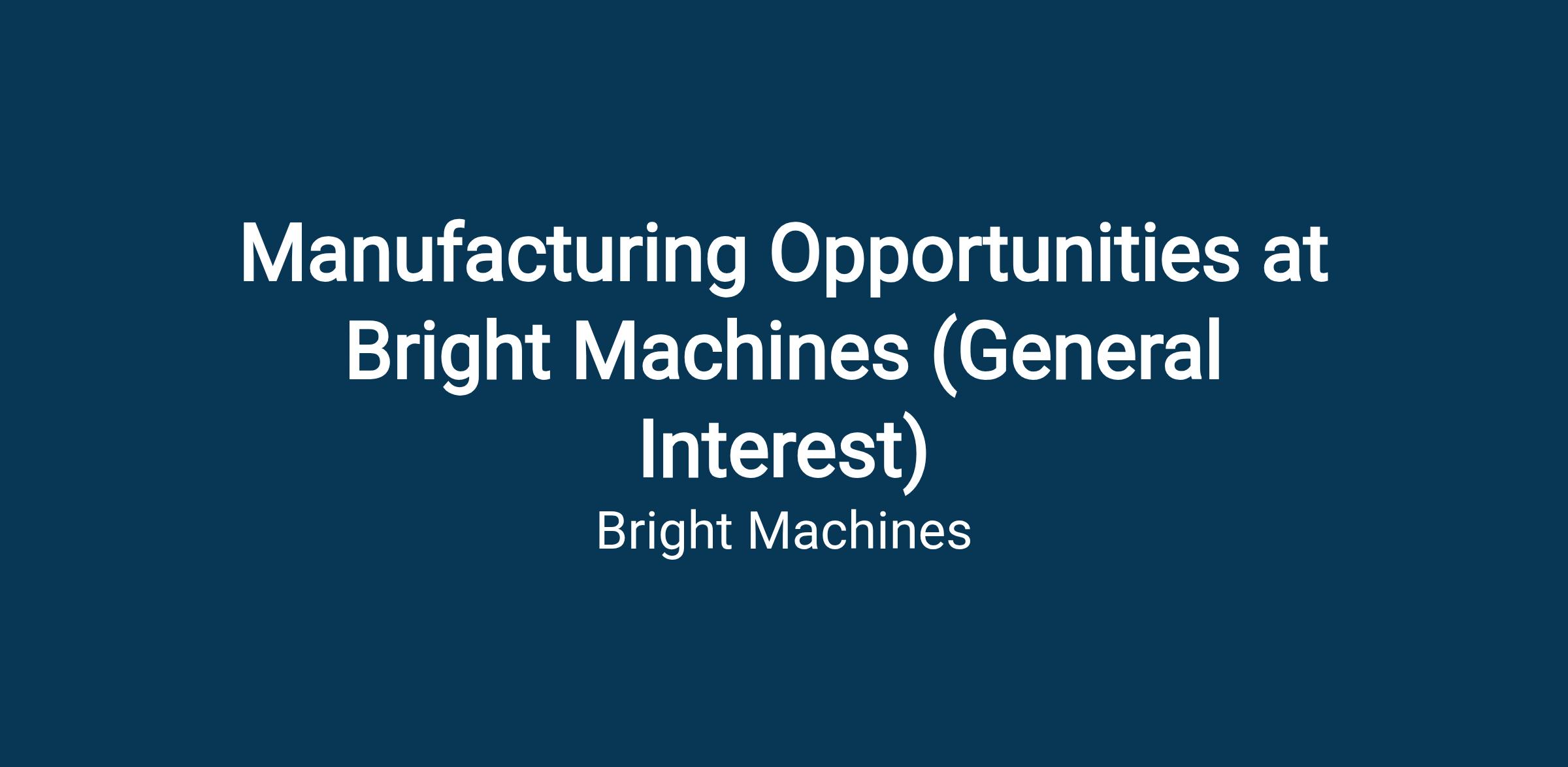 Bright Machines is always interested in connecting with manufacturing professionals who want to be part of the next generation of intelligent, automated production. Our CVG manufacturing site plays a critical role in building, integrating, and scaling advanced automation systems. While we may not have an immediate opening that matches your background today, we are continuously planning for future growth and would welcome the opportunity to learn more about you for upcoming manufacturing-related roles.