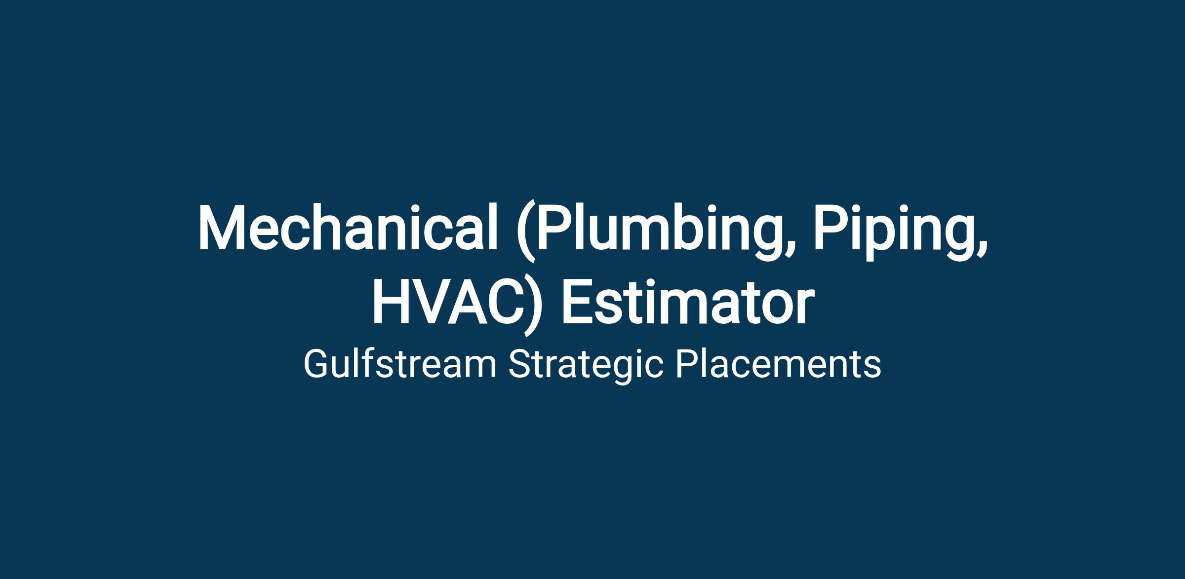 We are currently looking for a Mechanical (Plumbing, Piping, HVAC) Estimator to fill an immediate opening. The ideal candidate will have at least 5 years of experience in mechanical estimating.