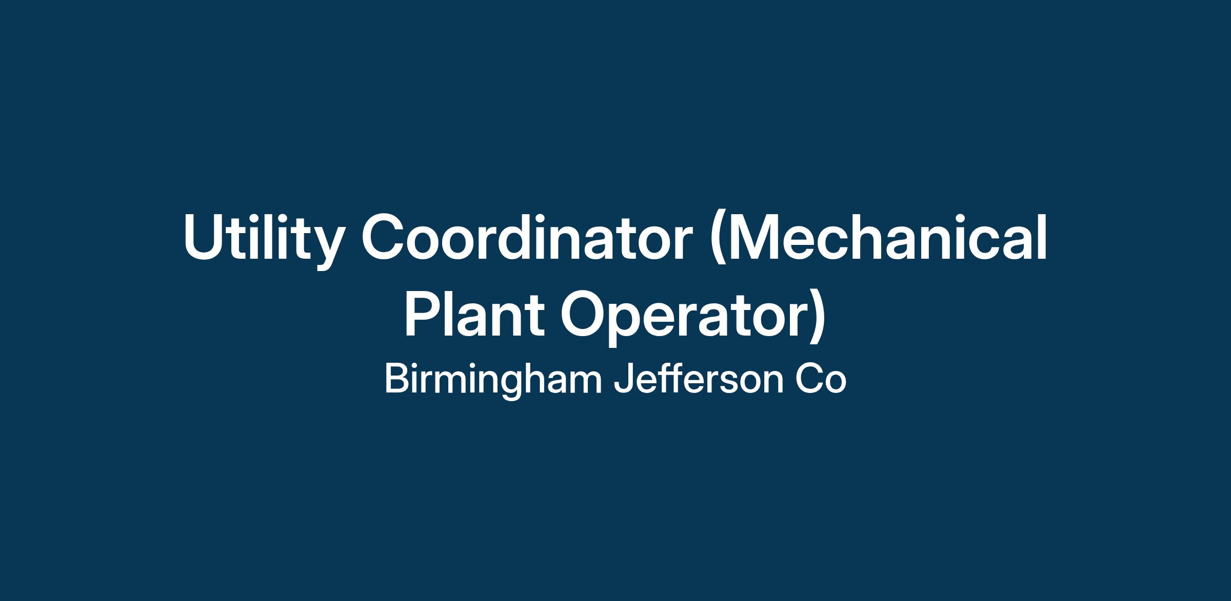 The Utility Coordinator will participate in the following mechanical work with responsibilities for coordinating activities involved in producing and distributing heat, hot water, chilled water and air conditioning to the entire Birmingham Jefferson Convention Complex by operating, maintaining and repairing the Mechanical Plant equipment such as boilers, pipe systems, pumps, hot water generators, and air-cooling units.